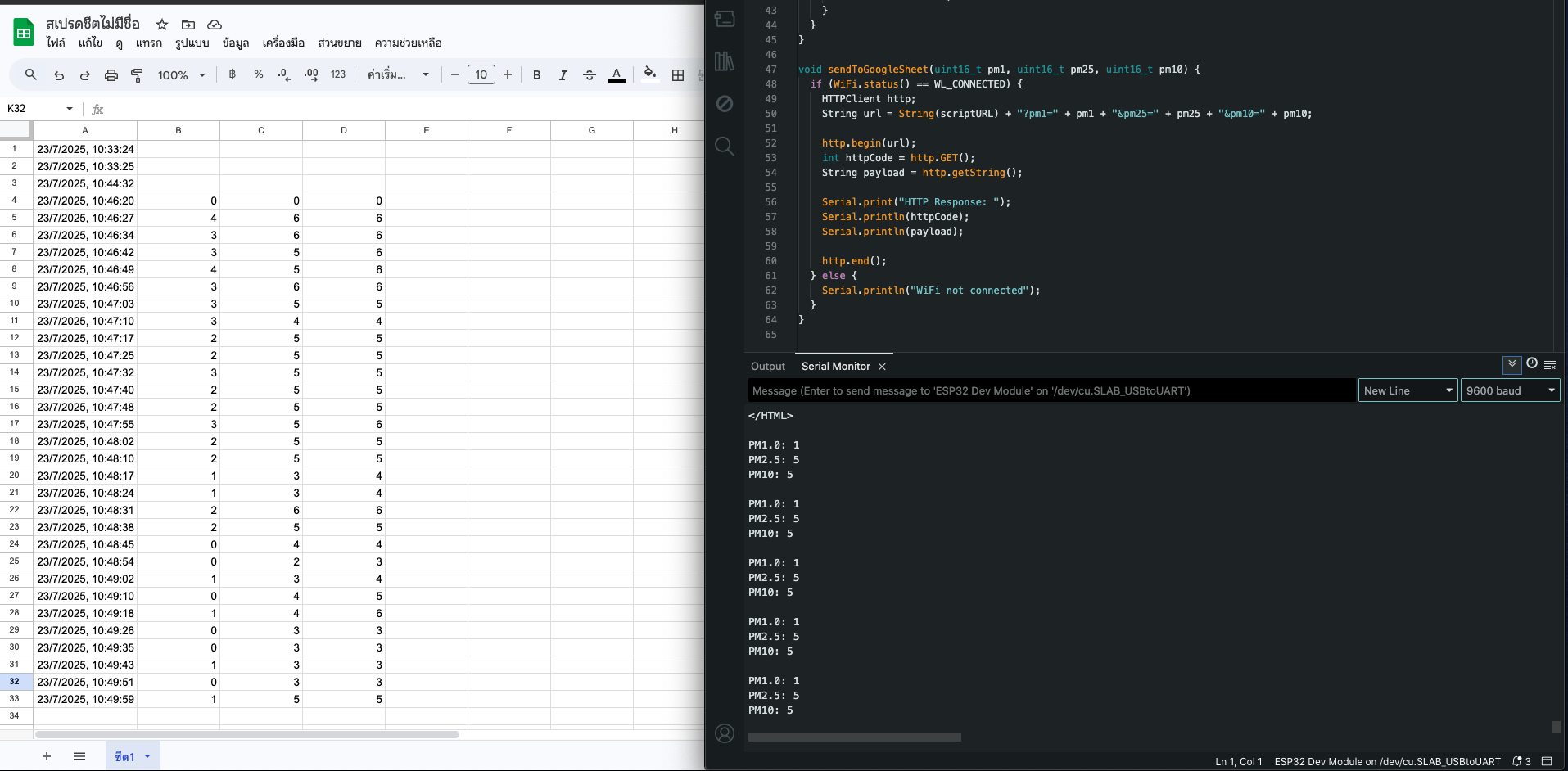 ESP32 บันทึกค่าเซ็นเซอร์วัดฝุ่น จาก Dustation ลง Google Spreadsheets