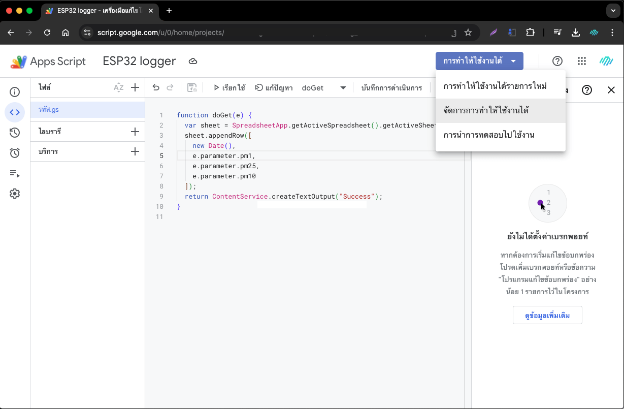 แนวทางการใช้ ESP32 บันทึกค่าเซ็นเซอร์วัดฝุ่น จาก Dustation ลง Google Spreadsheets ร่วมกับ Google Apps Script
