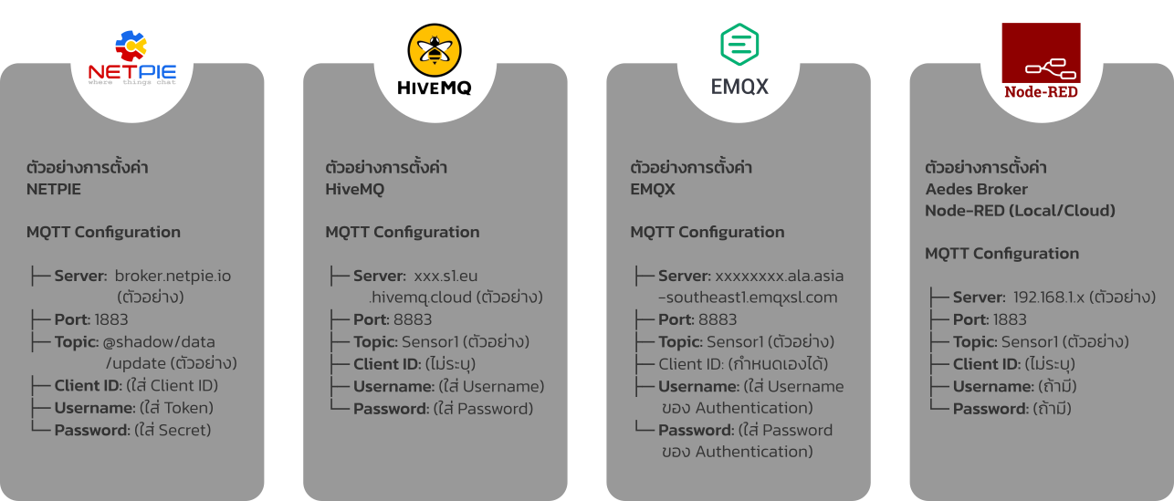 - รองรับโหมด IoT บนคลื่น Wi-Fi 2.4GHz ด้วยโปรโตคอล MQTT (QoS0) รองรับการเชื่อมต่อกับแพลตฟอร์ม Aedes Broker (Node-RED Local/Cloud), NETPIE, HiveMQ, EMQX รองรับทั้งพอร์ต 1883 (ไม่เข้ารหัส) และ 8883 (SSL/TLS ไม่ตรวจสอบ CA)
