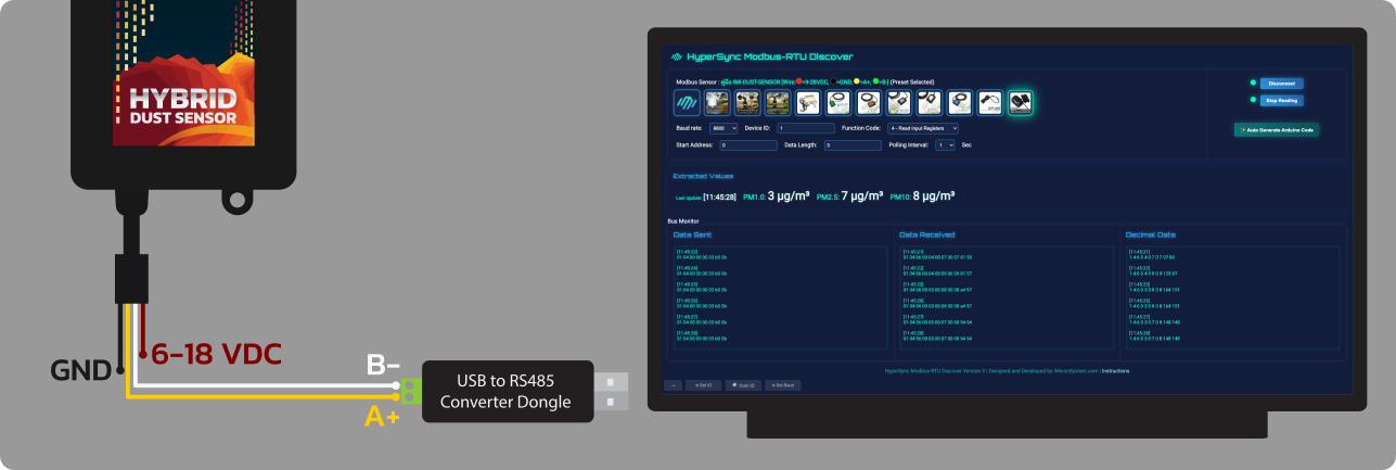 - รองรับการเปลี่ยน Modbus Slave ID (1-247) และ Baudrate (4800, ค่าเริ่มต้น: 9600, 19200, 38400, 57600) ผ่านโปรโตคอล Modbus หรือหน้าเว็บตั้งค่า