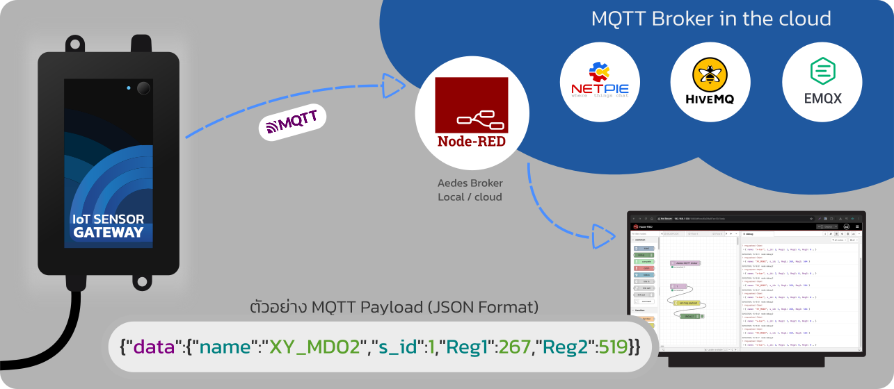 - MQTT Payload: JSON Format ตัวอย่าง: {"data":{"name":"sensor","Reg1":28,"Reg2":68}}