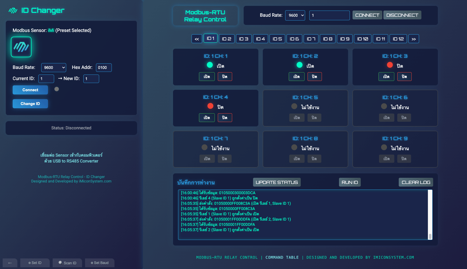 - คลิก RUN เพื่อเปิดและปิดรีเลย์ทั้งหมดของ ID ปัจจุบันตามลำดับ